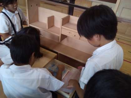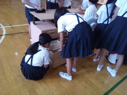 いま流行の机2台を体育館で見せていただき、学習机づくりの工夫や苦労を教えていただきました。