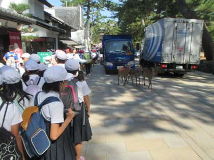 早速、シカを見つけ「かわいい〜〜〜」の歓声があがりますが、歩いていくうちにどんどんシカが寄ってきて「でかっ!」「こわ〜」と圧倒されていました(-_-;)