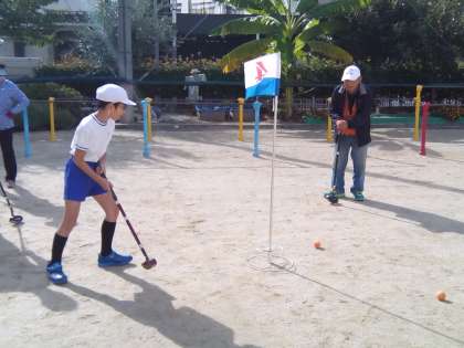 5年生は老人会のみなさんから、グランドゴルフの競技方法やブンブンゴマ・ガリガリプロペラ・糸編みこけし・ブレスレットの作り方を習いました。みんな楽しそうです。