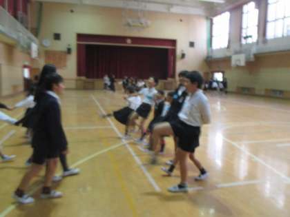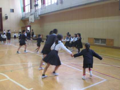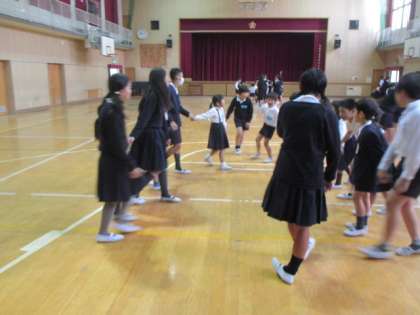 休み時間、1年生と6年生が仲良く手をつないで「はないちもんめ」をしていました。