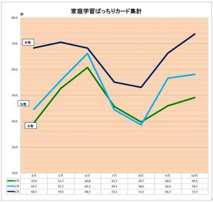 2学期に入り、家庭学習の平均時間が増えてきました。しかし、目標時間を超えて学習をしている子と、ほとんどしていない子の差が広がっています。家での様子はいかがでしょうか?落ち着いて机に向かっている時間が短いお子さんには、「今日は10分がんばろう」と励ましてあげてください。そして、できたら、ほめてあげてください。毎日積み上げることで必ず習慣になってきます。半年後に15分・20分と増えていけばいいのです。