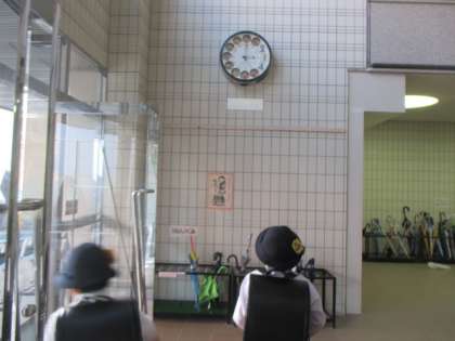 3時の時計です。子どもたちが見上げています。