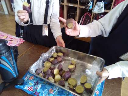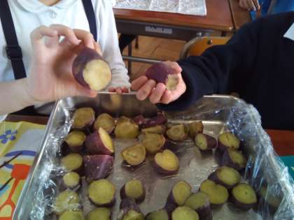 2年生が、第二グランドで育てたサツマイモをみんなで食べました。
