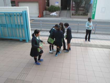 朝の登校時に門に立って募金を呼びかけています。