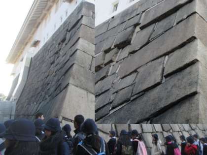 写真中:天守閣の北側をのぞいてみると、石垣がずれているのを見ることができます。1トン爆弾の衝撃でずれたのだそうです。