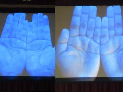 2番目の写真は、手にどれだけ汚れがついているかを特殊な光を当てて確かめています。
