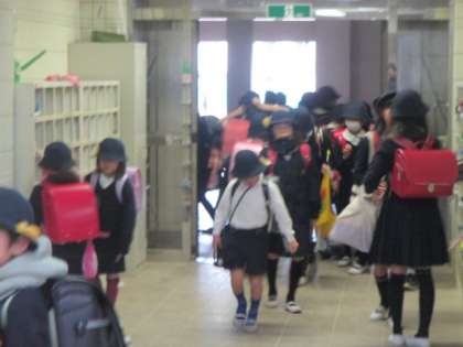 集団登校に間に合わない子もちらほら見かけますが、ほとんどの登校班が時間通り正門をくぐっています。
