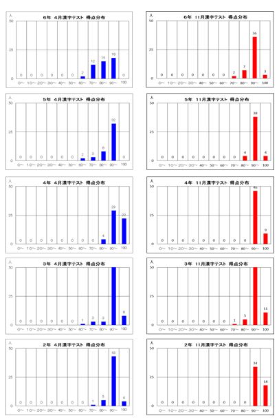 どの学年も成績が向上しています。練習の成果が出ていますね。また、漢字の細かな部分を意識して書く子が多くなり、文字が丁寧になってきました。覚えた漢字は、どんどん使うことで定着していきます。がんばりましょう。