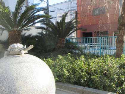 子どもたちが元気に遊ぶ一方で、校門ではカメがお日様を見つめていました。