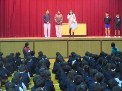 児童朝会では、給食調理員さんに来ていただき、給食調理員さんへの質問に答えてくださったり、各学級でつくった感謝のメッセージを渡したりして、子どもたちと交流しました。