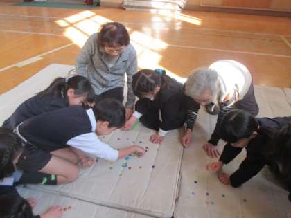 2年生と地域の老人クラブの皆さんが、昔から伝わる遊びを通して交流しました。