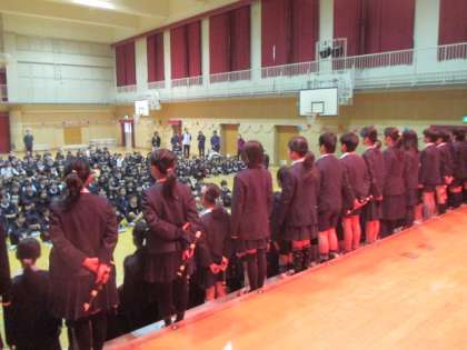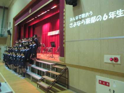 最後は、1〜5年生の全員で、卒業をお祝いする歌を歌いました。(写真中)舞台に立つのは緊張しますが、6年生はそれをどの学年よりも経験しています。立ち姿も堂々としています。