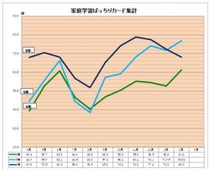 6年生は、やや学習時間が減っています。今は、卒業関係の行事や式の練習などで忙しい時期ですが、6年間の復習や読書などをして、毎日学習する習慣を維持するようにしてほしいと思います。