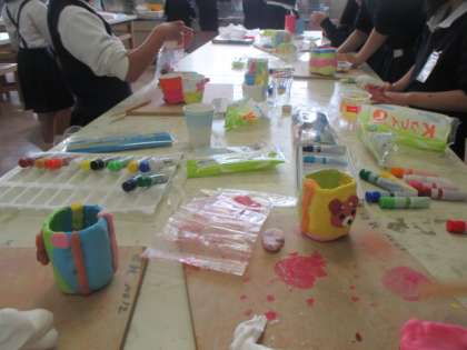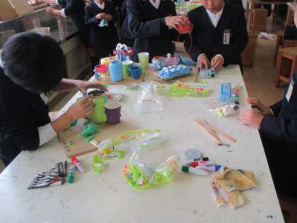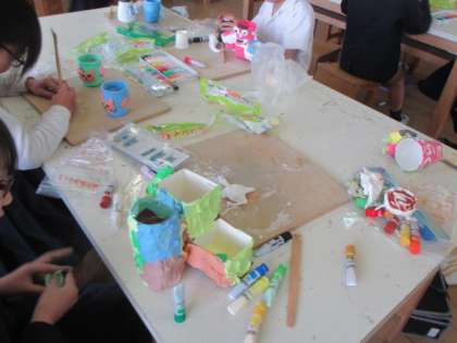 紙パックやペットボトルにかみねんどをつけて、きれいに色もぬって…もうすぐ出来上がりそうですね。