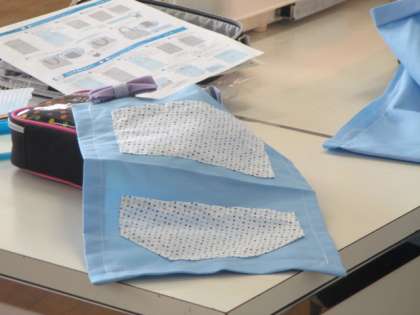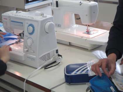 図工室の向かいの家庭科室では、6年生がミシンを使って作業中でした。