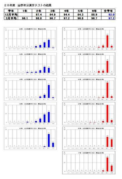 漢字確認テスト当学年分の結果が出ました。どの学年も朝学タイムの漢字練習や各学級での漢字練習を通して、成績が伸びました。また、丁寧に漢字を書く子が多くなり、「きれいな字でかけました」のシールを貼ってもらった子もぐんと増えたように思います。漢字テストに限らず、ノートやプリントも意識してていねいに書くようにしてほしいと思います。続けていくうちに、ていねいでも速く書けるようになります。