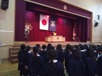 今日は修了式です。2日前に6年生が卒業したため、1年生から5年生までが講堂に集まりました。