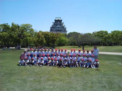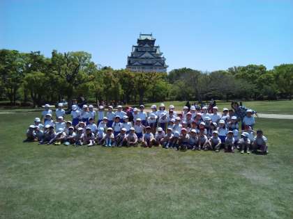 大阪城をバックに、学年ごとで集合写真。赤い帽子が1年生、白い帽子が2年生です。