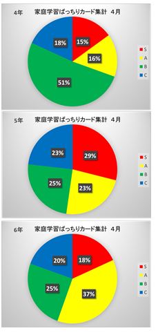 4月分家庭学習ばっちりカードの集計ができました。本年度から、家庭での学習の様子をS・A・B・Cを自分で評価する形に改良しました。グラフは、各学年のそれぞれの割合を示しています。1年後に向けて、SやAの割合が増えてくれることを期待しています。