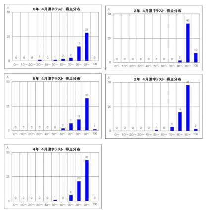 漢字確認テスト1回目の結果が出ました。今回のテストは、1年生を除く学年で行いました。出題範囲は、前学年の内容です。