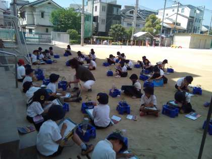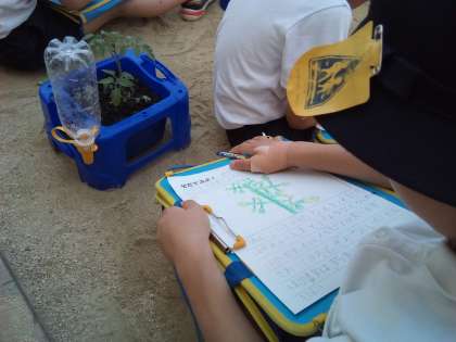 2年生が運動場で、自分が育てているミニトマトを観察しています。葉っぱに触って匂いを確かめたり、いろいろな方向から見たりして、地面に座り込んで一生懸命に調べています。みんなで美味しいトマトができるを楽しみにしています。