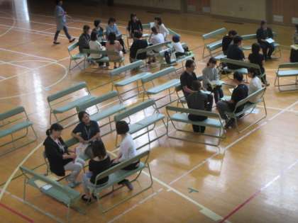 写真は、全体会後の各委員会での集まりです。教職員を交えて「今年は何をしようかな〜?」と話し合っています。