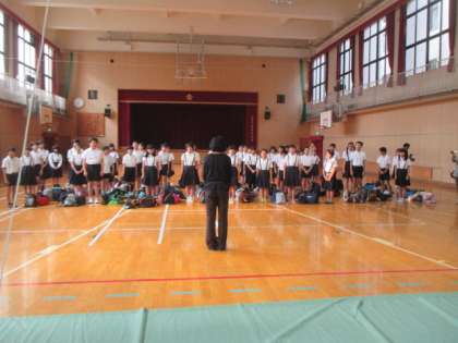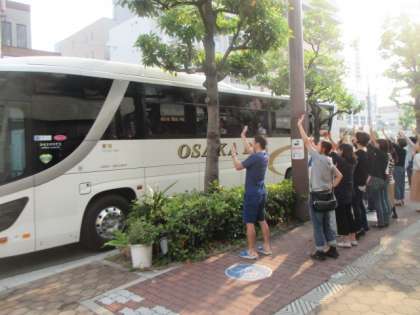 6年生の修学旅行、先ほど出発しました。全員そろって、みんな笑顔いっぱいでした。