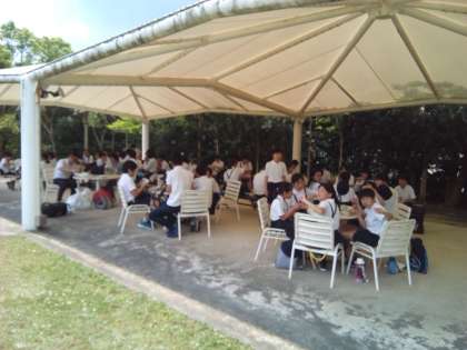 早速ですが、家族の愛情いっぱいのお弁当タイム。グループで楽しく食べています。天気も良くて最高です。