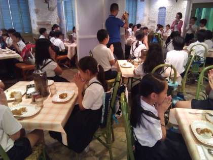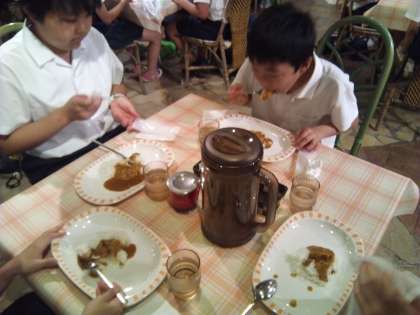 昼食はカレーバイキングです。チキンカレー、ビーフカレー、ポークカレーの3種類があります。この後、バスで学校まで帰るので、食べ過ぎには注意しましょう。
