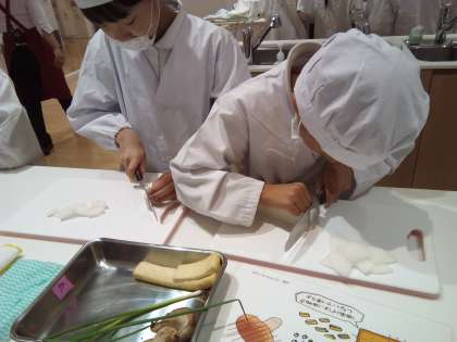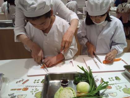 みんなで協力して、野菜炒め、味噌汁、ご飯、ふりかけをエコクッキングしています。慣れた様子の子どももいますが、危なっかしい包丁づかいの子どももいます。怪我しないように気をつけて。