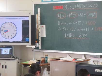 時計の針を見て時刻がわかるようにすること、時計を見て時間を足したり引いたりすることなど、低学年を中心に何度かに分けて学習します。