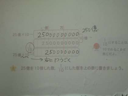 10倍するごとに位が一つ上がること、10分の1で位が一つ下がること、などを学習します。