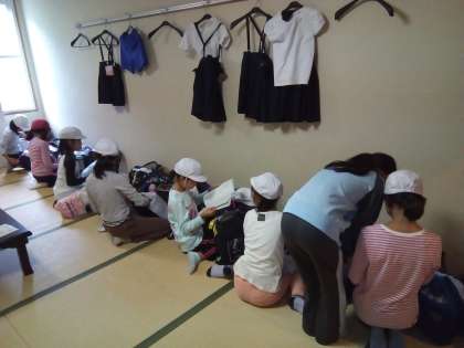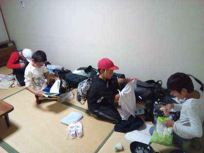 制服から活動しやすい服装に着替えて、荷物整理をしています。次は避難訓練。安全対策は重要です。