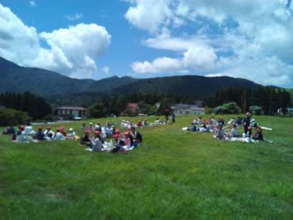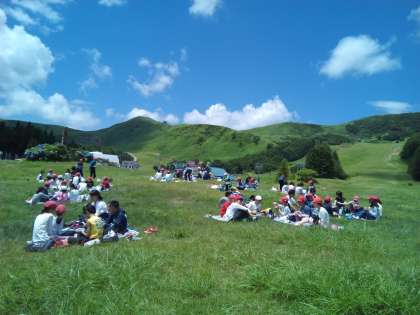 班で楽しく、お弁当を食べています。高原で食べる愛情弁当は、最高です。清々しい風が吹いていて気持ちいいですよ。
