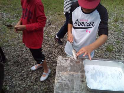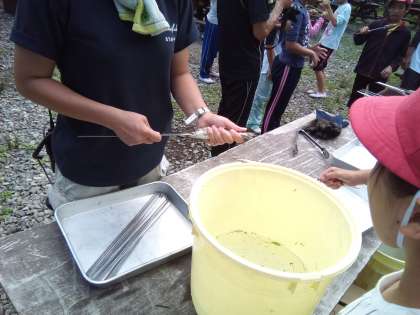 捕まえた魚は、串に刺してもらって自分で塩をつけます。