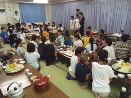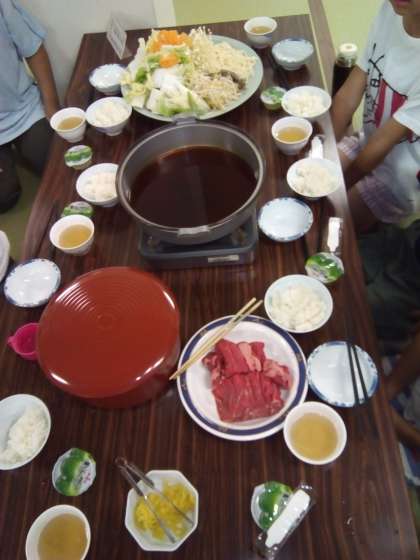 夕食はすき焼きです。班で協力して、仲良くお鍋を食べましょう。