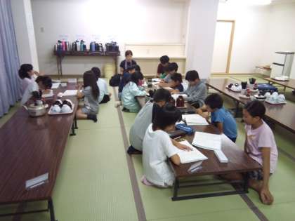 今日の反省とともに明日の予定を確認しました。この後、各部屋に戻ってみんなに内容を伝えます。