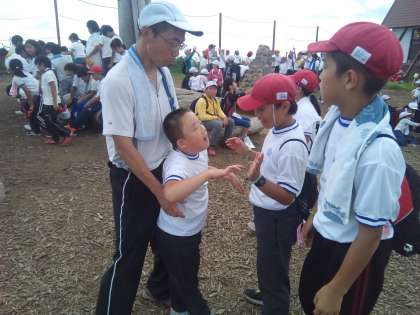 頂上に到着しました。好ちゃんとハイタッチで喜んでいます。
