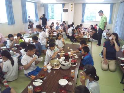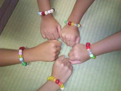 今日の昼食は牛丼です。ブレスレットをつけて、みんなで美味しくいただきました。