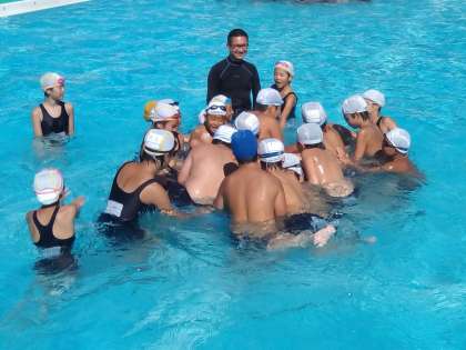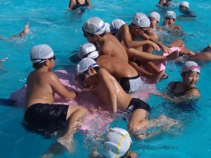 浮き島に何人乗れるかを2クラスで競い合っています。