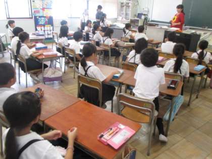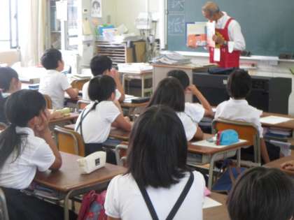 赤いエプロンをしたひまわりのお兄さんお姉さんがおもむろに教室に入られると、子どもたちが席について読み聞かせが始まります。