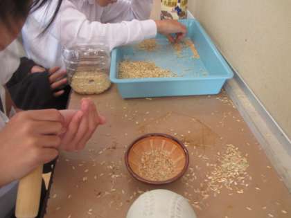 5年生が育てたイネは刈り取られ、教室でもみ殻をはずしています。