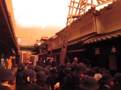 写真上:江戸時代の町並みは、夜になると本当に暗くなります。明かりはほの暗い行燈だけ、昔の人はこんな明るさでで暮らしていたんですね。