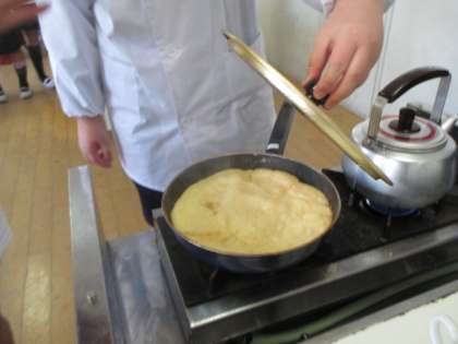 フライパンで焼いて、お皿にひっくり返すと、アップルケーキのできあがり〜!羽根つき餃子ちゃうで〜