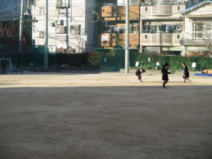 こんな寒風が吹く運動場でも、登校して運動場で遊ぶ元気な子もいます。