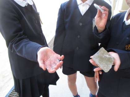 水たまりにできた氷をうれしそうに見せてくれました。