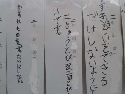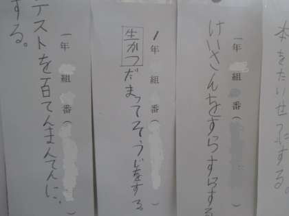 写真上:1年生らしいかわいい決意です。何かしていてもしゃべっている人、いますよね(笑)