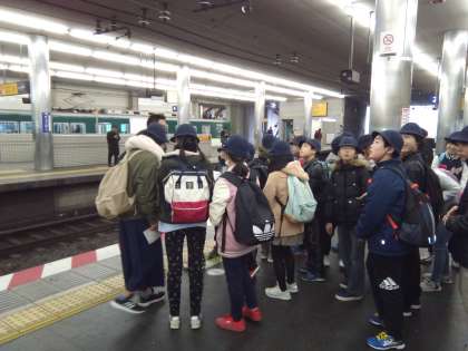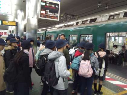 今日は6年生にとって、最後の校外学習。ひらかたパークへ卒業遠足に出発です。京橋駅から京阪電車に乗り込みます。さあ、『ひがみや』としての品位を保ちながらも、思いっきり楽しむぞ〜。