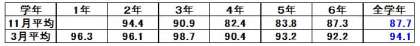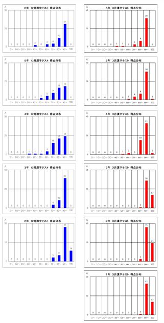 漢字確認テスト2回目の結果(現在の学年の内容)が出ました。1回目の結果と比べると、ほとんどの子が成績を伸ばしました。また、ていねいに漢字を書いている子が増え、今回は、むしろ「ひらがな」の△の方が目立ちました。「ん」と「人」、「や」と「か」、「む」と「お」などの文字の区別が難しかったり、「ひょう」を「ひよう」と書いていたりです。