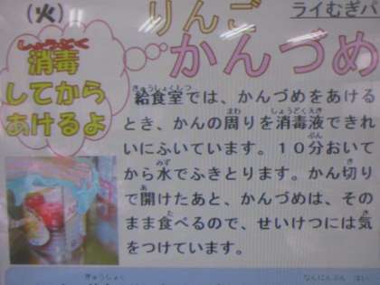 じゅうぶんに行き届いた衛生管理のもとで、給食がつくられていることを子どもたちにも知らせています。